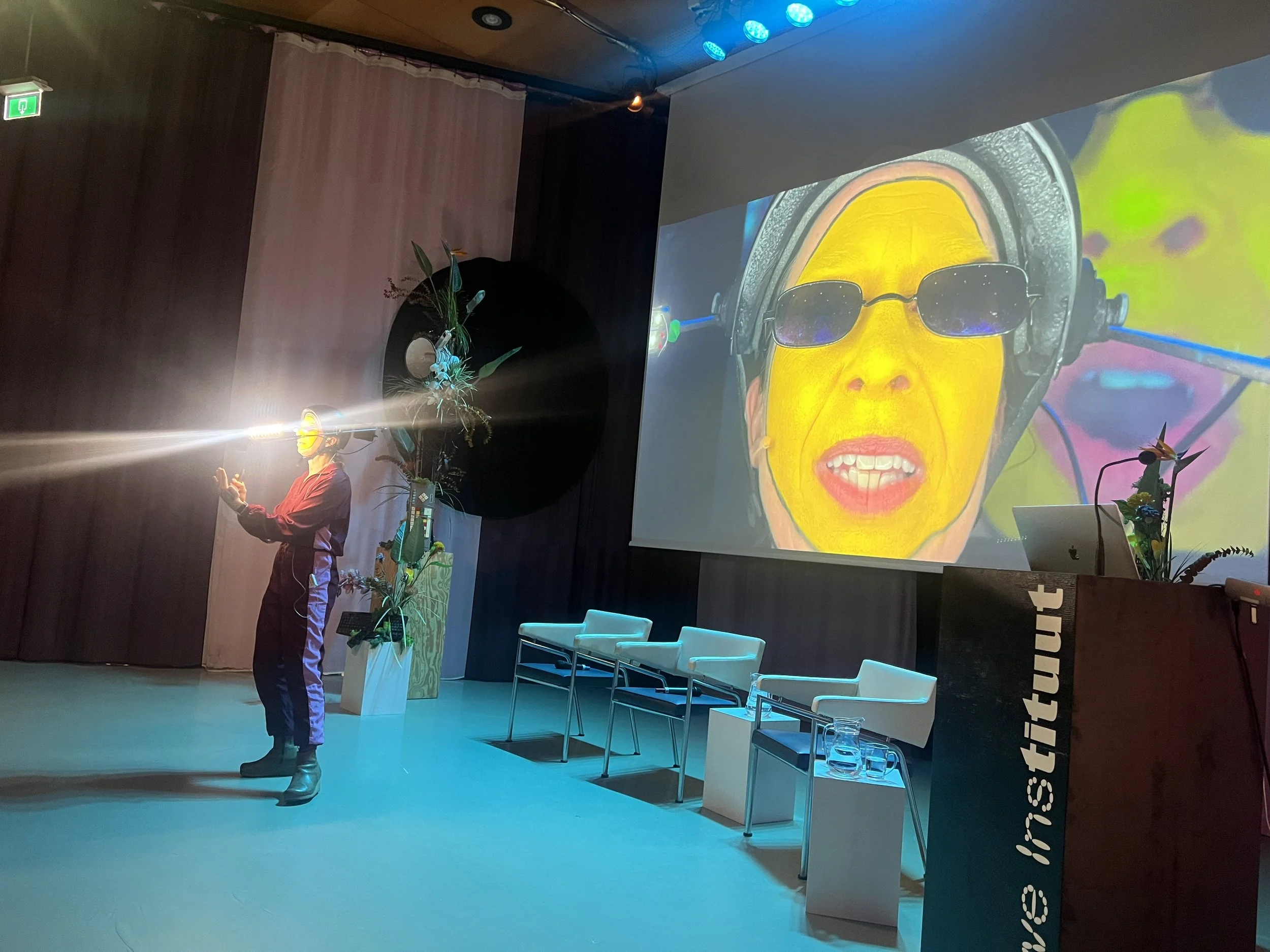 The event opened with a performance by Luna Maurer and Roel Wouters. Luna Maurer recited the text of their new manifesto, in which she calls on us to embrace friction and facilitate it in our interaction, design, technology. In the meantime, her associate Roel Wouters drew a QR code by hand, which linked to the text of the manifesto 'Designing Friction': https://designingfriction.com/